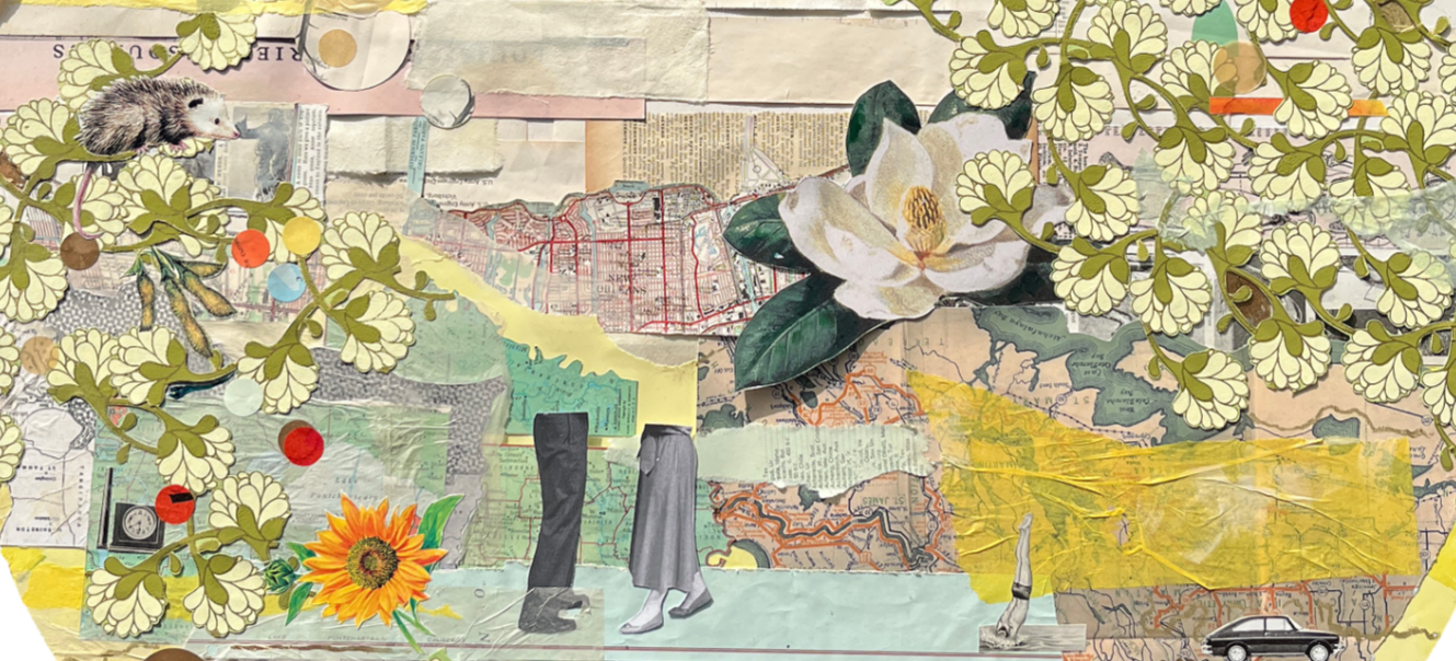 Amelia Broussard, a Louisiana native, creates mixed media collages inspired by her childhood explorations of the bayous. Through her use of recycled papers, she captures the essence of her memories, exploring their unreliability while also finding joy and appreciation in the beauty of ordinary, everyday things.